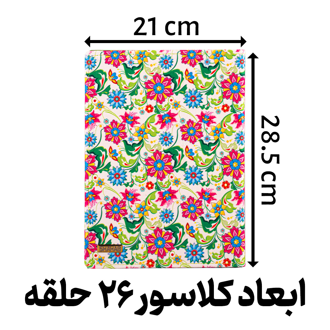 کلاسور 26 حلقه تهیه شده از جنس مقوای ضخیم صنعتی با روکش ترکیبی از پارچه ی مخمل گلدار و چرم مصنوعی باکیفیتِ دور دوخت شده که علاوه بر دوام بالا دارای بافت و ترکیب رنگ زیبایی است که مناسب برای استفادههای متوالی میباشد؛ جنس قفل کلاسور از جنس فلز میباشد؛ که برای باز و بسته شدنهای متوالی جهت چیدمان و جابجایی کاغذها دارای مقاومت بالاتری نسبت به قفل پلاستیکی می باشد و ظرفیت قرار دادن 160 برگ کاغذ در آن وجود دارد. این کلاسور به همراه 80 برگ کاغذ می باشد که از ویژگی های این محصول قابل استفاده بودن کاغذ های 26 حلقه ی موجود در بازار برای این کلاسور می باشد
