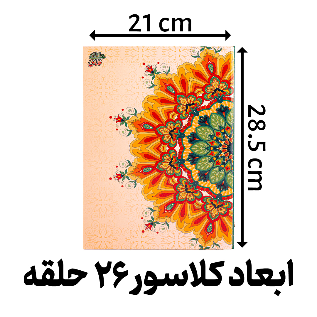 کلاسور 26 حلقه تهیه شده از جنس مقوای ضخیم صنعتی با روکش کاغذ چاپ شده طرح دار به همراه روکش سلفون مات یا براق که دارای تنوع طرح بالا و ترکیب رنگ زیبایی است؛ جنس قفل کلاسور از جنس فلز می‌باشد؛ که برای باز و بسته شدن‌های متوالی جهت چیدمان و جابجایی کاغذ‌ها دارای مقاومت بالاتری نسبت به قفل پلاستیکی می باشد و ظرفیت قرار دادن 160 برگ کاغذ در آن وجود دارد. از ویژگی های این محصول قابل استفاده بودن کاغذ های 26 حلقه ی موجود در بازار برای این کلاسور می باشد. محصول به همراه 80 برگ کاغذ و 4 عدد دیوایدر مقوایی ارسال می شود