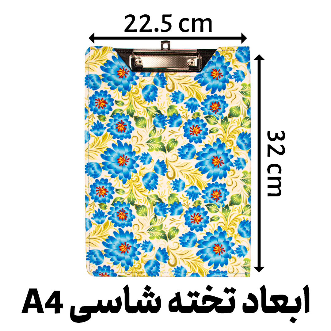 زیر دستی سایز A4 تهیه شده از جنس پارچه ای مخمل با حالت کلاسوری(تاشو) که رویه آن از جنس پارچه ای مخمل که با طرح های متنوع و زیبا و داخل آن نیز از جنس چرم مصنوعی تیره رنگ کار شده است که دارای جیب های متنوع(دو لَت) برای نگهداری کارت، مدارک و ... می باشد. این زیر دستی به طور کامل دور دوخت شده است که در تصاویر به خوبی دیده می شود. این محصول گزینه ی مناسبی برای افرادی است که به طور روزانه و دائم از زیر دستی و تخته شاسی استفاده دارند.