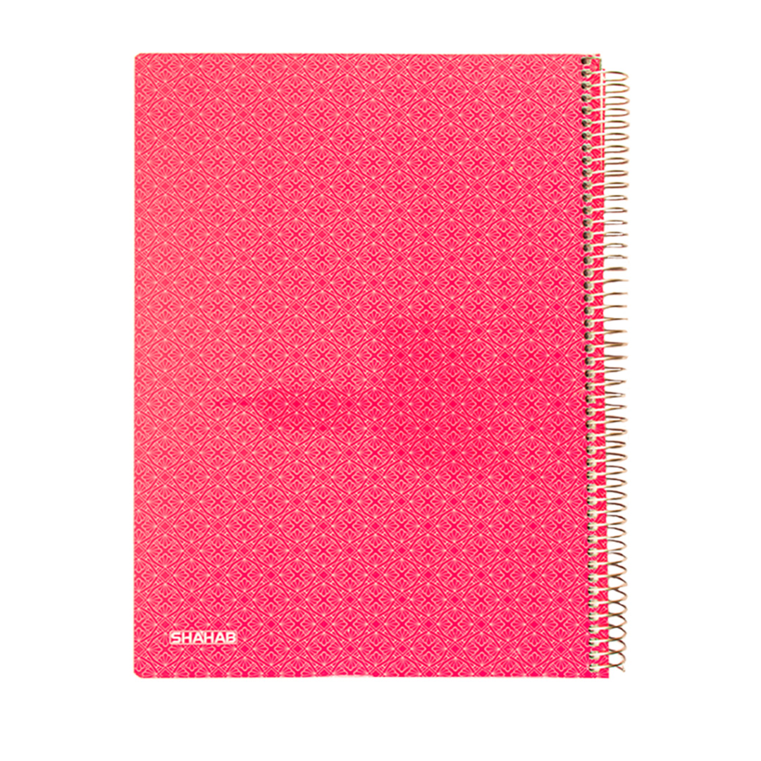 دفتر مجلد طرح های رنگی 50 برگ تهیه شده از جنس مقوای چاپ شده سلفون شده مات و براق جلد شده در ابعاد 24x17 سانتی‌متر، قطع وزیری که نوع صحافی آن فنر مارپیچ فلزی می باشد.