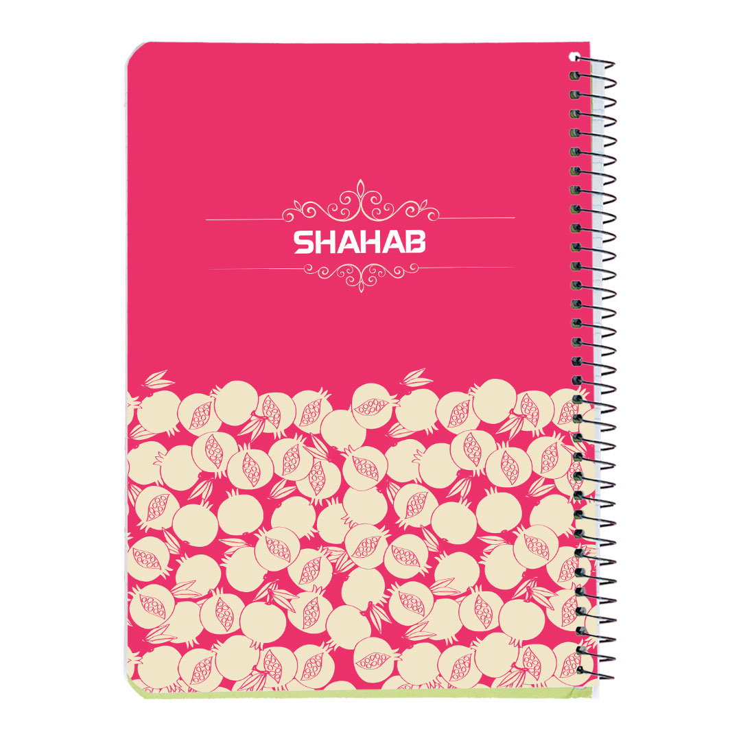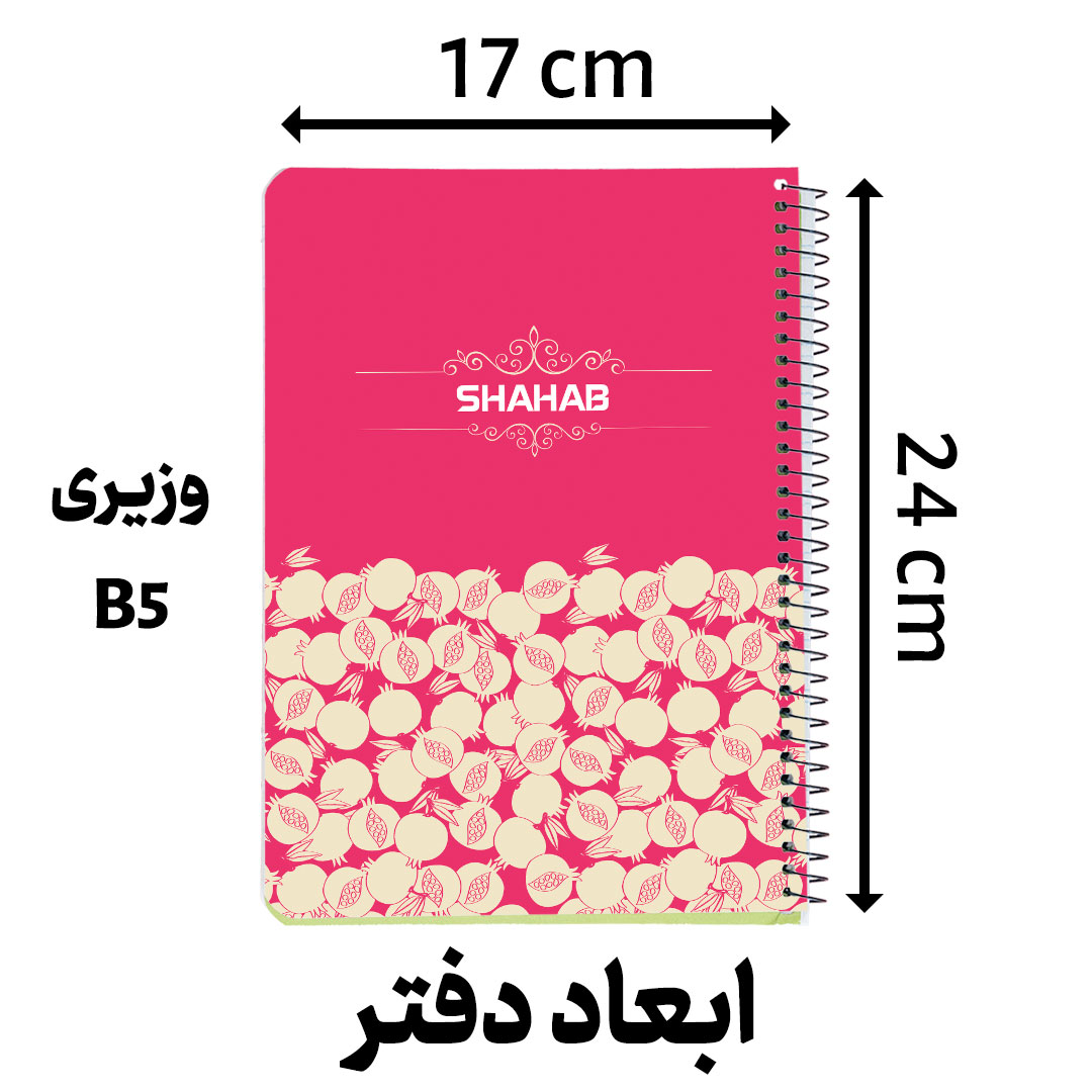 دفتر مجلد طرح های رنگی 50 برگ تهیه شده از جنس مقوای چاپ شده سلفون شده مات و براق جلد شده در ابعاد 24x17 سانتی‌متر، قطع وزیری که نوع صحافی آن فنر مارپیچ فلزی می باشد.