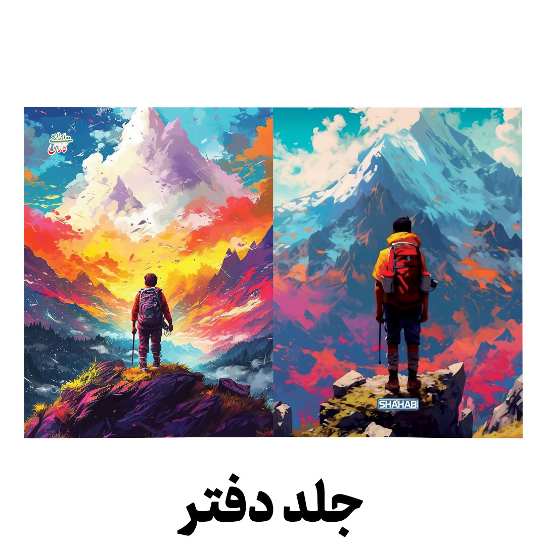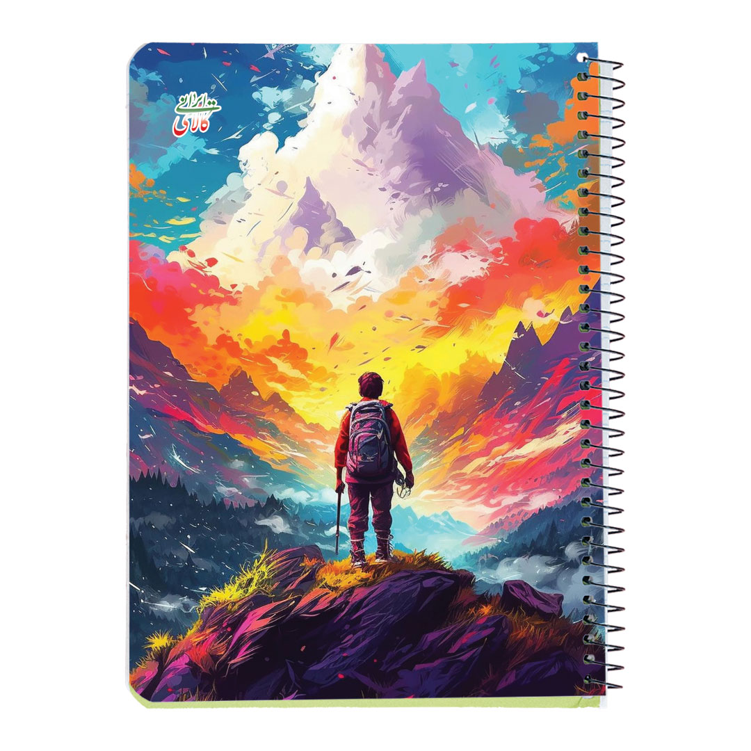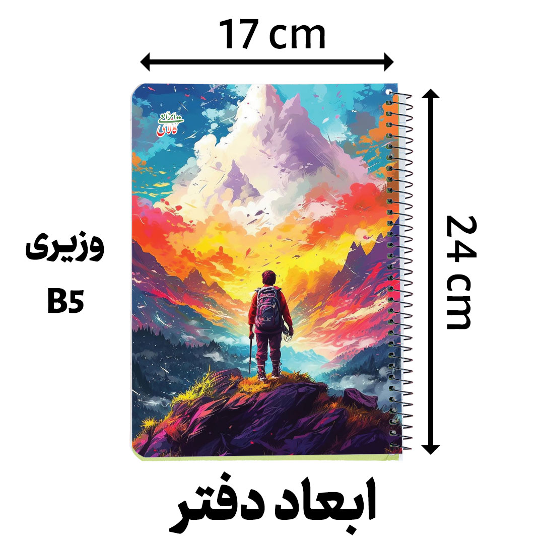 دفتر مجلد طرح های رنگی 50 برگ تهیه شده از جنس مقوای چاپ شده سلفون شده مات و براق جلد شده در ابعاد 24x17 سانتی‌متر، قطع وزیری که نوع صحافی آن فنر مارپیچ فلزی می باشد.